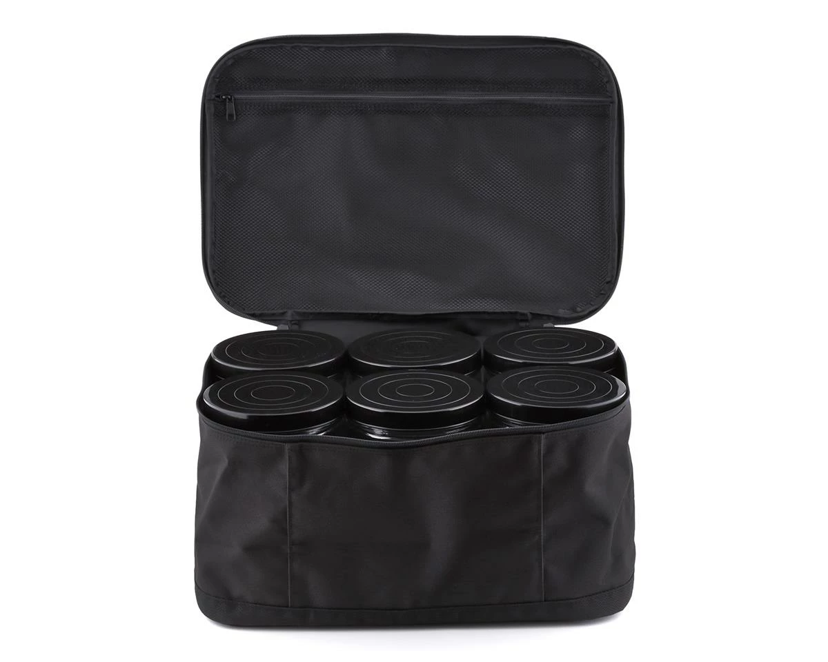 The ProTek RCÂ 1/8 Buggy Tire Bag is a convenient way to haul and preserve your tires, as well as anything else that fits inside one of six included, airtight 8″ tall, 4.75″ diameter screw on lid storage tubes. The bag itself is made from heavy duty nylon material and measures 17″ wide, 12″deep and 9″ tall. The lid of the bag features a large ProTek RC logo in white, and has a 16×11″ mesh zipper pocket on the inside providing a place to stash setup sheets, tools or other small accessories that may come in handy at the track. If you are serious about keeping your gear neat and tidy, this bag is a must have accessory.