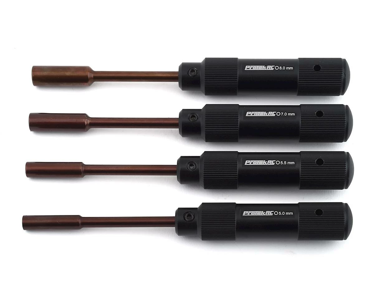 ProTek R/C nut drivers feature 20mm diameter machined aluminum handles that have been knurled to provide a high leverage, non slip surface that will be comfortable to use during long wrenching sessions. The tool size is etched into the handle for easy identification and a black rubber cap is fitted to the end to increase comfort during use. The precision cut tool steel tips provide an exceptional fit with the fastener, and feature a bronze colored finish that not only looks good, but also helps to protect the steel from corrosion.